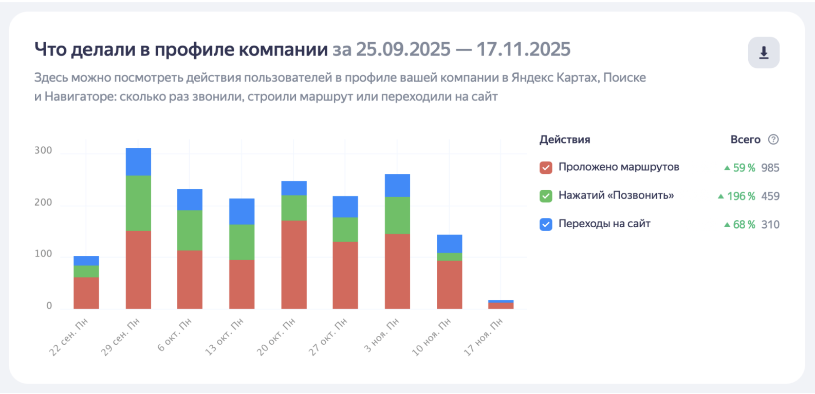 - Целевые действия (переходы на сайт, звонки, заказы) значительно увеличились, что подтверждает успешность улучшений.