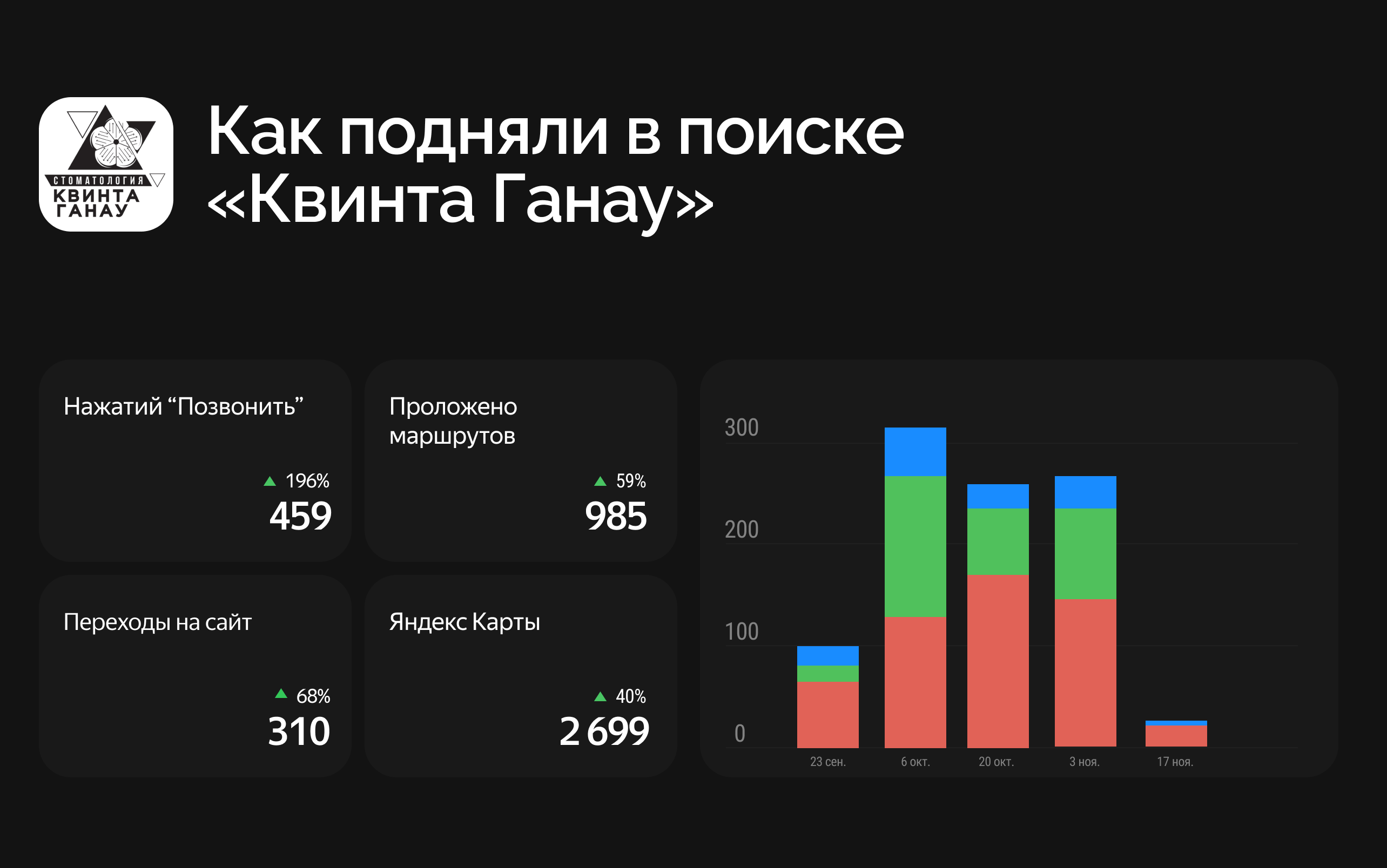 - Переходы из Яндекс.Карт увеличились на 68% (310) — карточка стала более заметной и привлекательной, что привело к росту переходов.