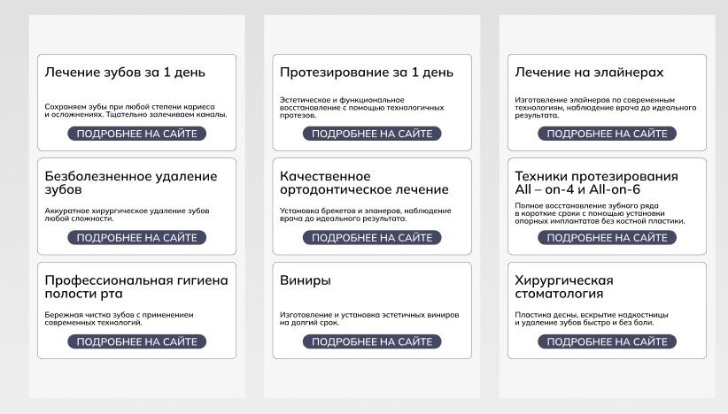 - Основная информация была неполной, что вызывало вопросы у потенциальных клиентов, и было сложно оценить преимущества стоматологии.
