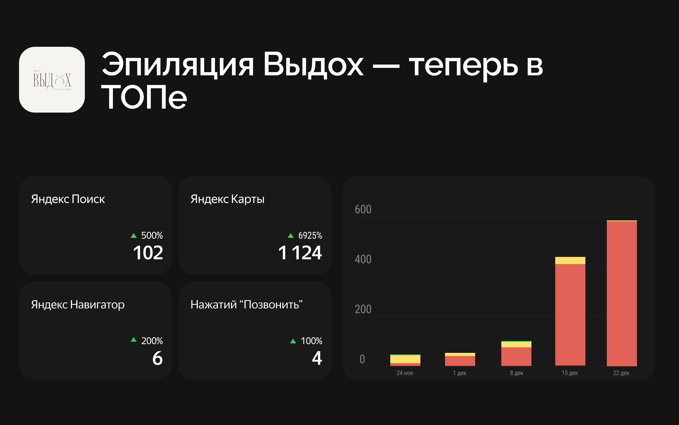 «Выдох» — студия эпиляции, где выбор у клиента обычно быстрый: посмотрел, сравнил, почувствовал доверие — и записался. В такой нише карточка на Яндекс.Картах часто становится первым касанием, которое либо приводит человека к действию, либо отправляет его дальше по выдаче.