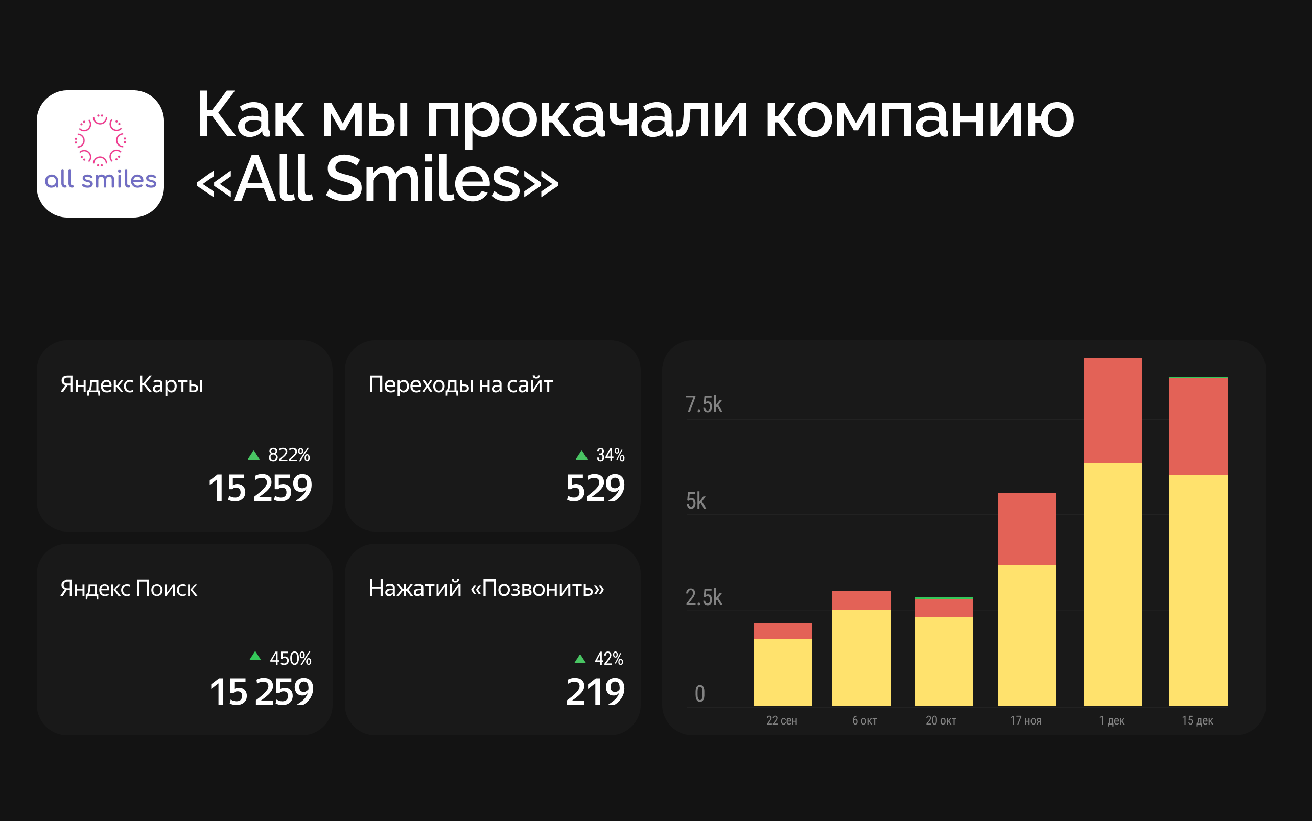 Цель упаковки была проста: улучшить видимость, актуализировать информацию и сделать карточку «All Smiles» максимально привлекательной для потенциальных пациентов, чтобы они не просто посмотрели, а сразу перешли на сайт или записались на приём.