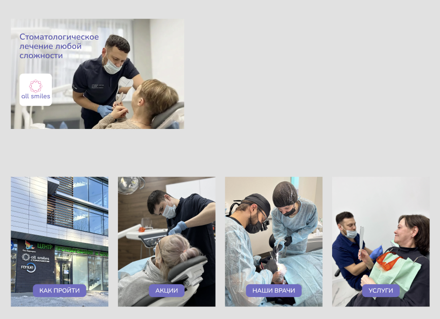 «All Smiles» — это стоматология, которая делает акцент на высококачественное лечение и комфортное обслуживание. В стоматологии, как и в любой медицинской сфере, доверие пациентов строится не только на опыте специалистов, но и на том, как легко клиент может найти нужную информацию, записаться на приём и получить первичное представление о месте.