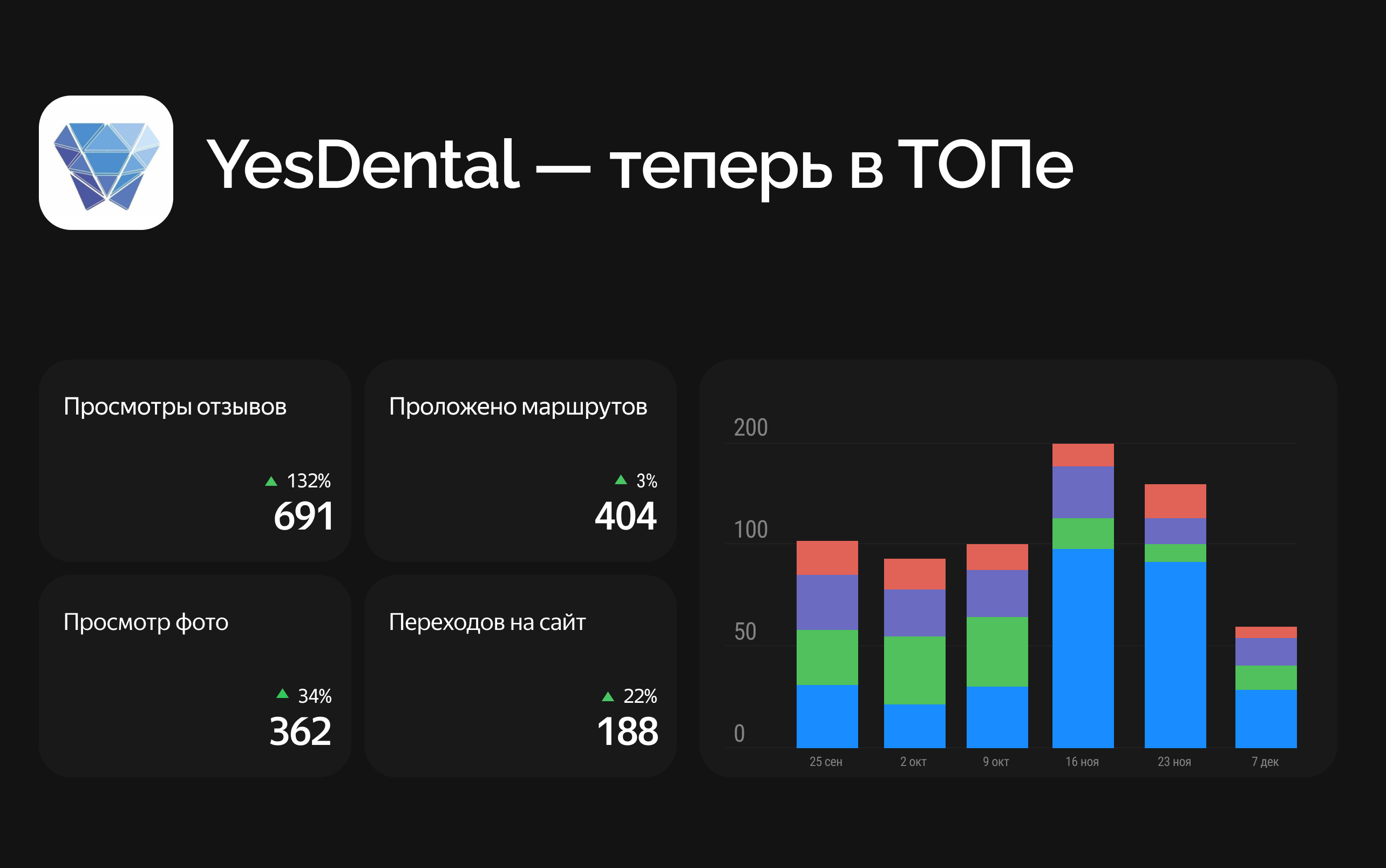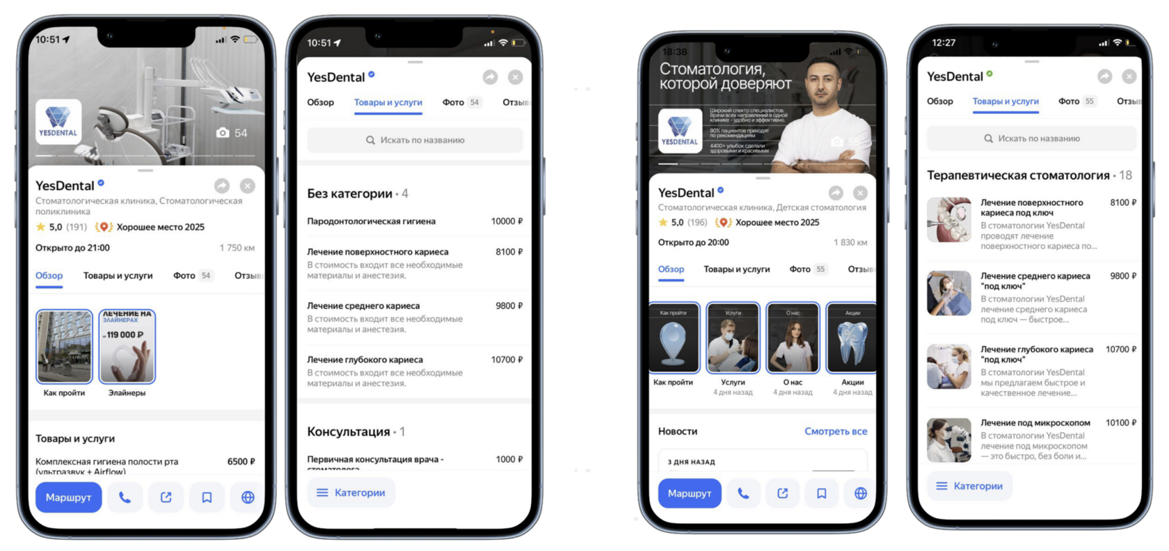 YesDental — стоматология, предоставляющая услуги по лечению зубов и поддержанию здоровья полости рта. Как и для многих медицинских учреждений, правильное размещение и «упаковка» в Яндекс.Картах — критически важный элемент в привлечение клиентов. Ведь потенциальные пациенты сначала ищут компанию на картах, а затем совершают звонки, записываются на прием и могут даже совершать покупки через интернет.