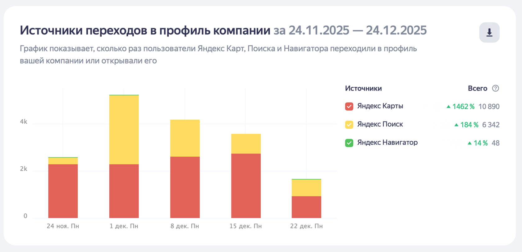 - Переходы в профиль из Яндекс.Карт увеличились на 1462% (10 890) — это прямой результат улучшения видимости и привлекательности карточки для пользователей.