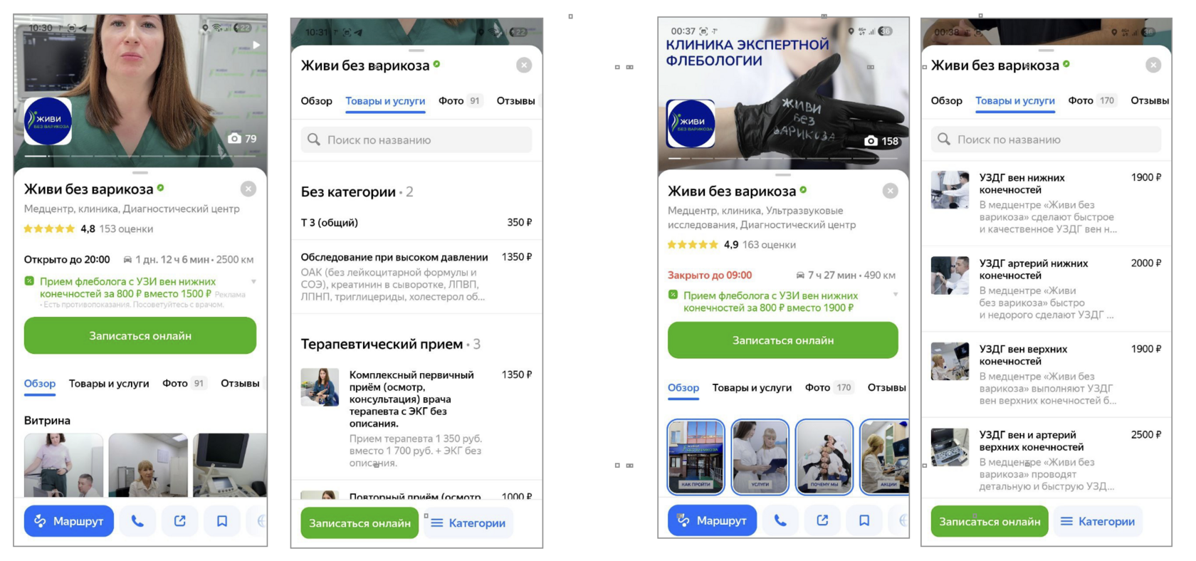 «Живи без варикоза» — клиника, специализирующаяся на лечении и профилактике варикозного расширения вен. В медицине доверие играет ключевую роль, и первым местом, куда обращается клиент, почти всегда становится Яндекс.Карты. Профиль на Картах должен быстро передать информацию о сервисе, доверии и удобстве — чтобы клиент сразу принял решение записаться на приём.